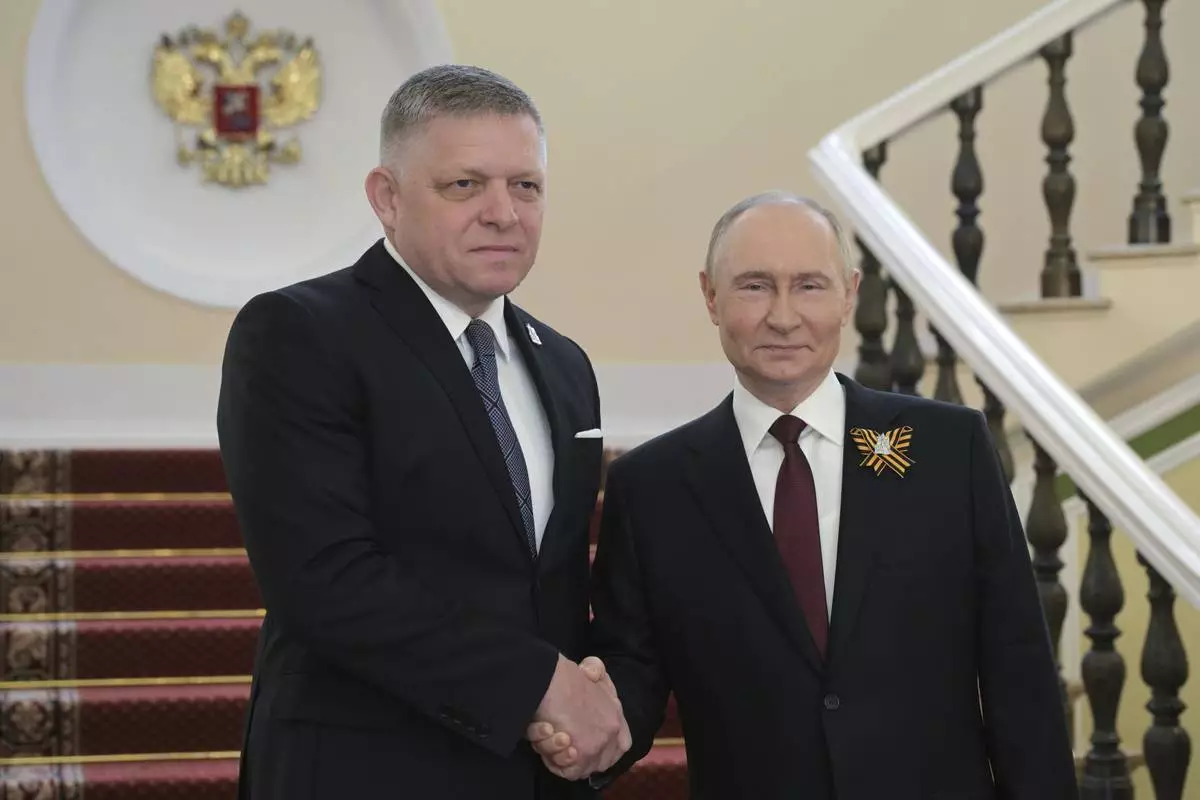 Prime Minister of Slovakia Robert Fico, left, and Russian President Vladimir Putin shake hands during their meeting before the Victory Day military parade in Moscow, Russia, Friday, May 9, 2025, during celebrations of the 80th anniversary of the Soviet Union's victory over Nazi Germany during the World War II. (Alexei Nikolsky/Photo host agency RIA Novosti via AP)