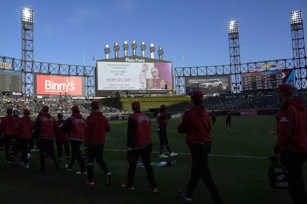 Chicago White Sox players walk on the field as the scoreboard honors Pope Leo XIV before a baseball game against the Miami Marlins, Friday, May 8, 2025, in Chicago. (AP Photo/David Banks)