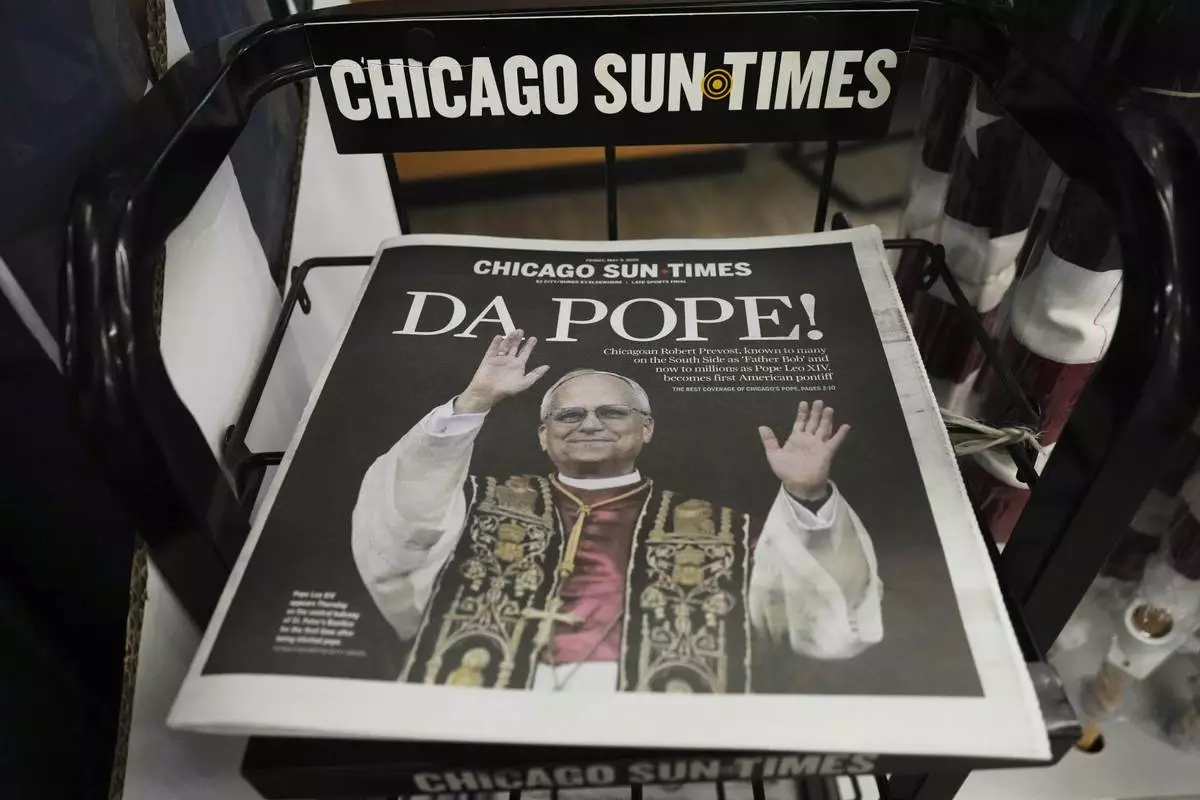 Chicago Sun Times newspaper front page showing Pope Leo XIV is seen on a newspaper rack at a store, Friday, May 9, 2025, in Chicago. (AP Photo/Melina Walling)