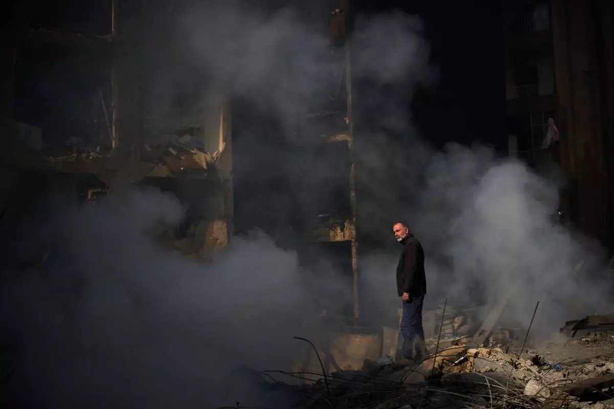 A man stands next to an apartment building destroyed in an Israeli airstrike a day earlier in Beirut, Lebanon, Thursday, April 9, 2026. (AP Photo/Emilio Morenatti)