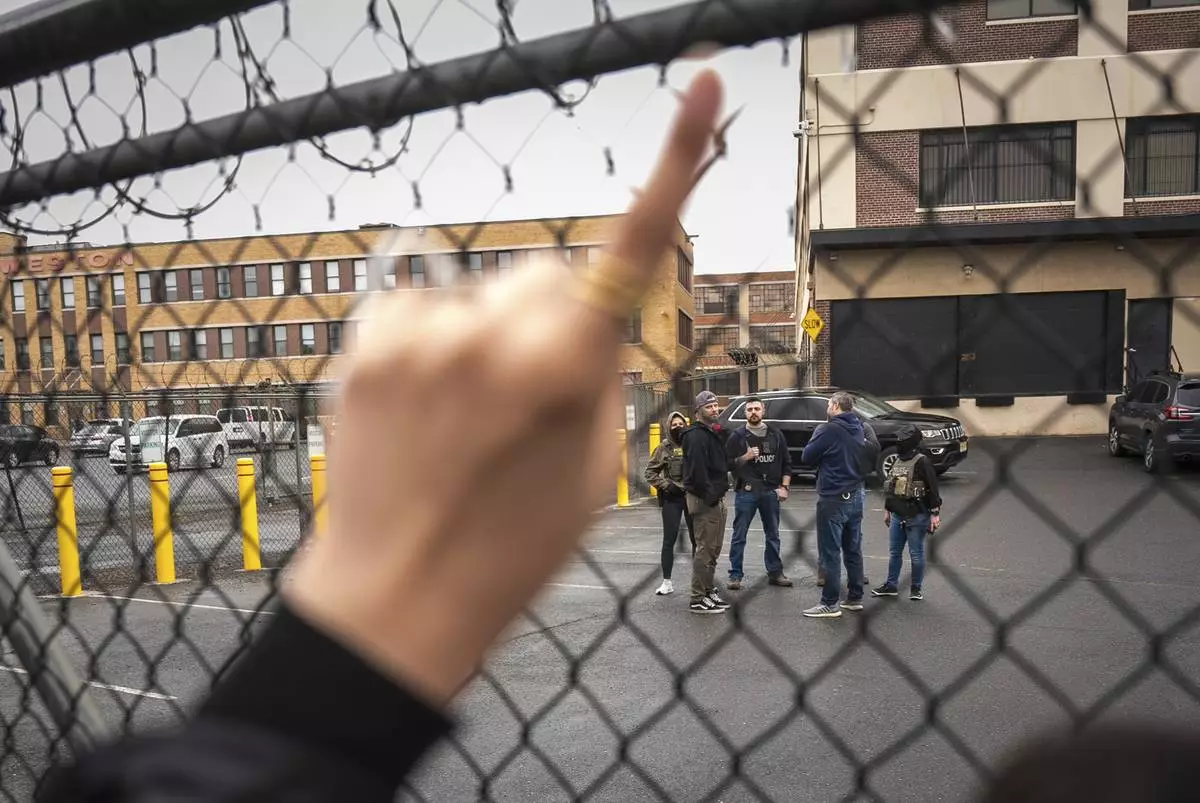 Protestors shout "Let him out" to demand the release of Newark Mayor Ras Baraka after his arrest while protesting outside an ICE detention prison, Friday, May 9, 2025, in Newark, N.J, (AP Photo/Angelina Katsanis)