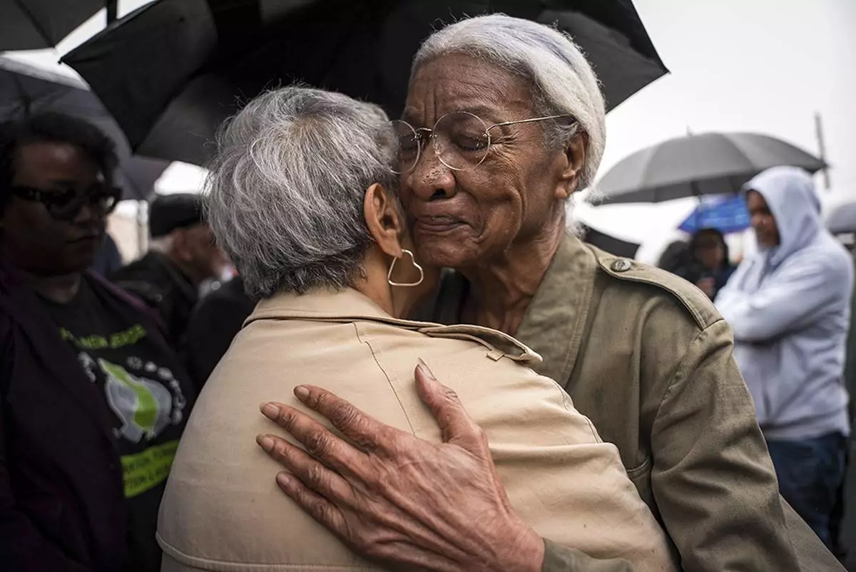 Amina Baraka, mother of Newark Mayor Ras J. Baraka, hugs Rep. Bonnie Watson Coleman, D-N.J., outside of an ICE office after her son's arrest, Friday, May 9, 2025, in Newark, N.J. (AP Photo/Angelina Katsanis)