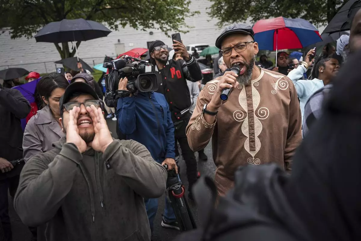Protestors demand the release of Newark Mayor Ras Baraka after his arrest at an ICE detention prison, Friday, May 9, 2025, in Newark, N.J, (AP Photo/Angelina Katsanis)