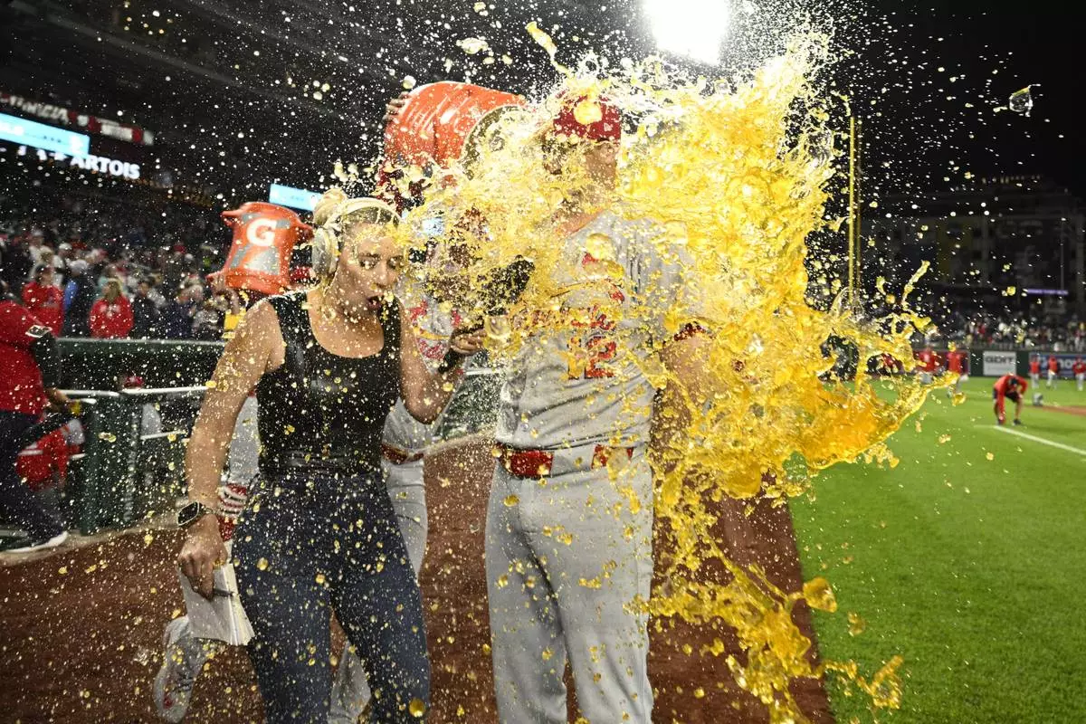 St. Louis Cardinals starting pitcher Erick Fedde (12) is doused during an interview after a baseball game against the Washington Nationals, Friday, May 9, 2025, in Washington. (AP Photo/Nick Wass)