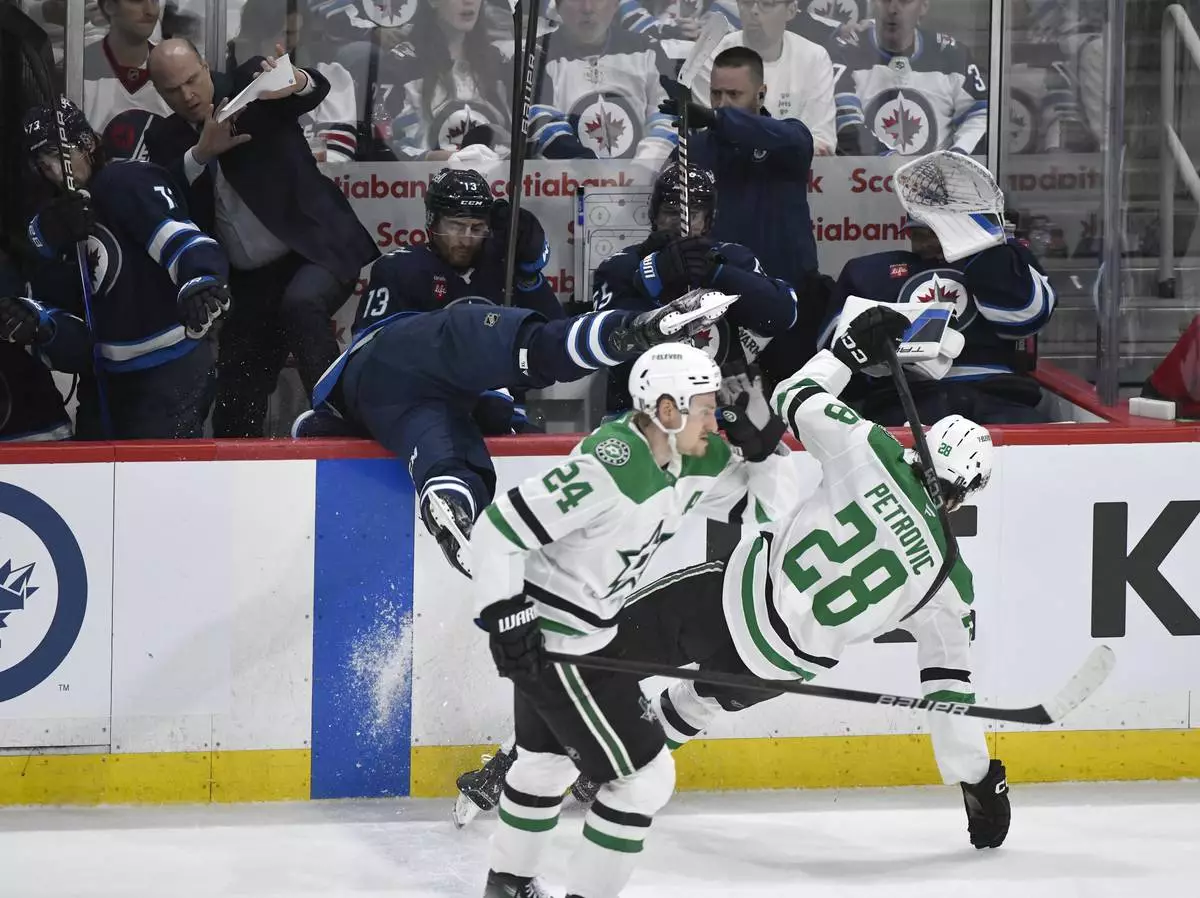 Dallas Stars' Alexander Petrovic (28) checks Winnipeg Jets' Adam Lowry, center, into the bench during the second period of Game 2 of a second-round NHL hockey playoff series in Winnipeg, Manitoba, Friday, May 9, 2025. (Fred Greenslade/The Canadian Press via AP)