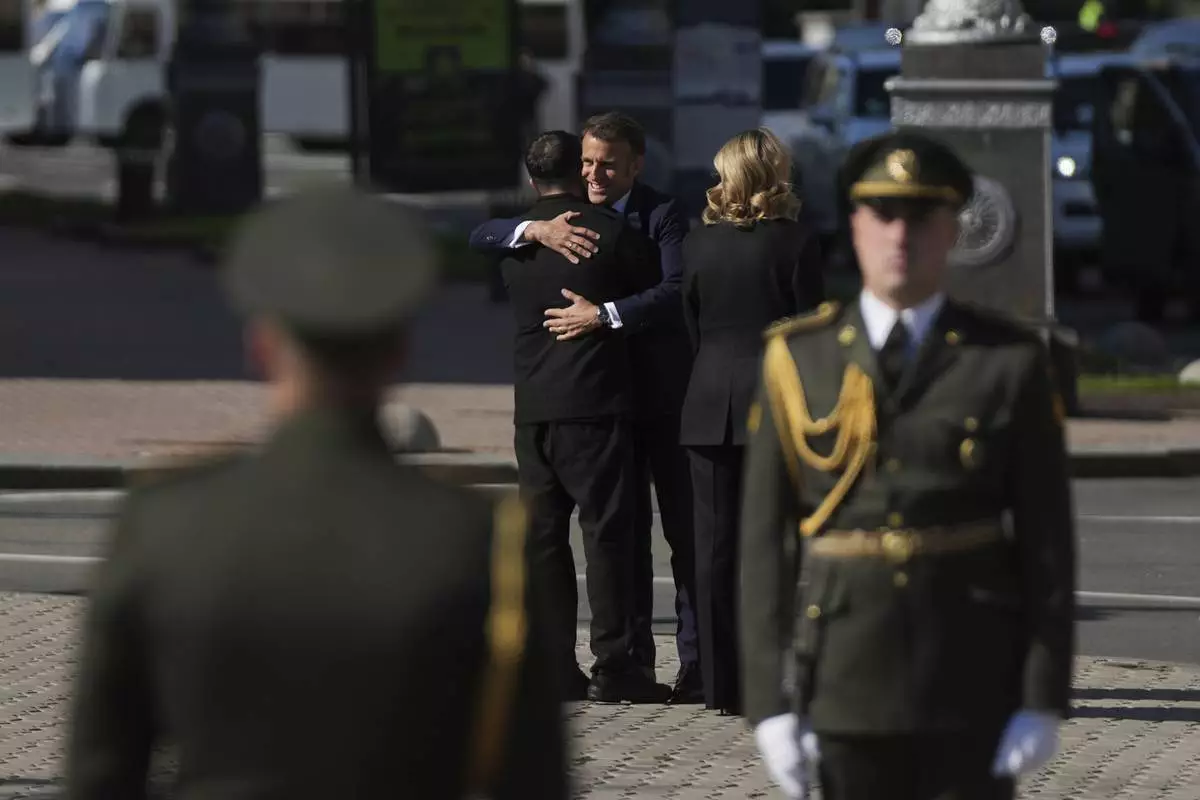 Ukrainian President Volodymyr Zelenskyy hugs French President Emmanuel Macron at the memorial of fallen Ukrainian soldiers at independence square in Kyiv, Ukraine, on Saturday, May 10, 2025. (AP Photo/Evgeniy Maloletka)