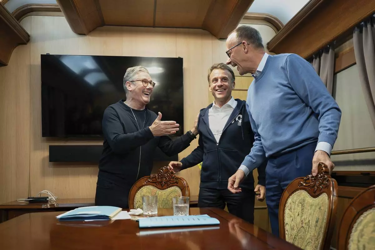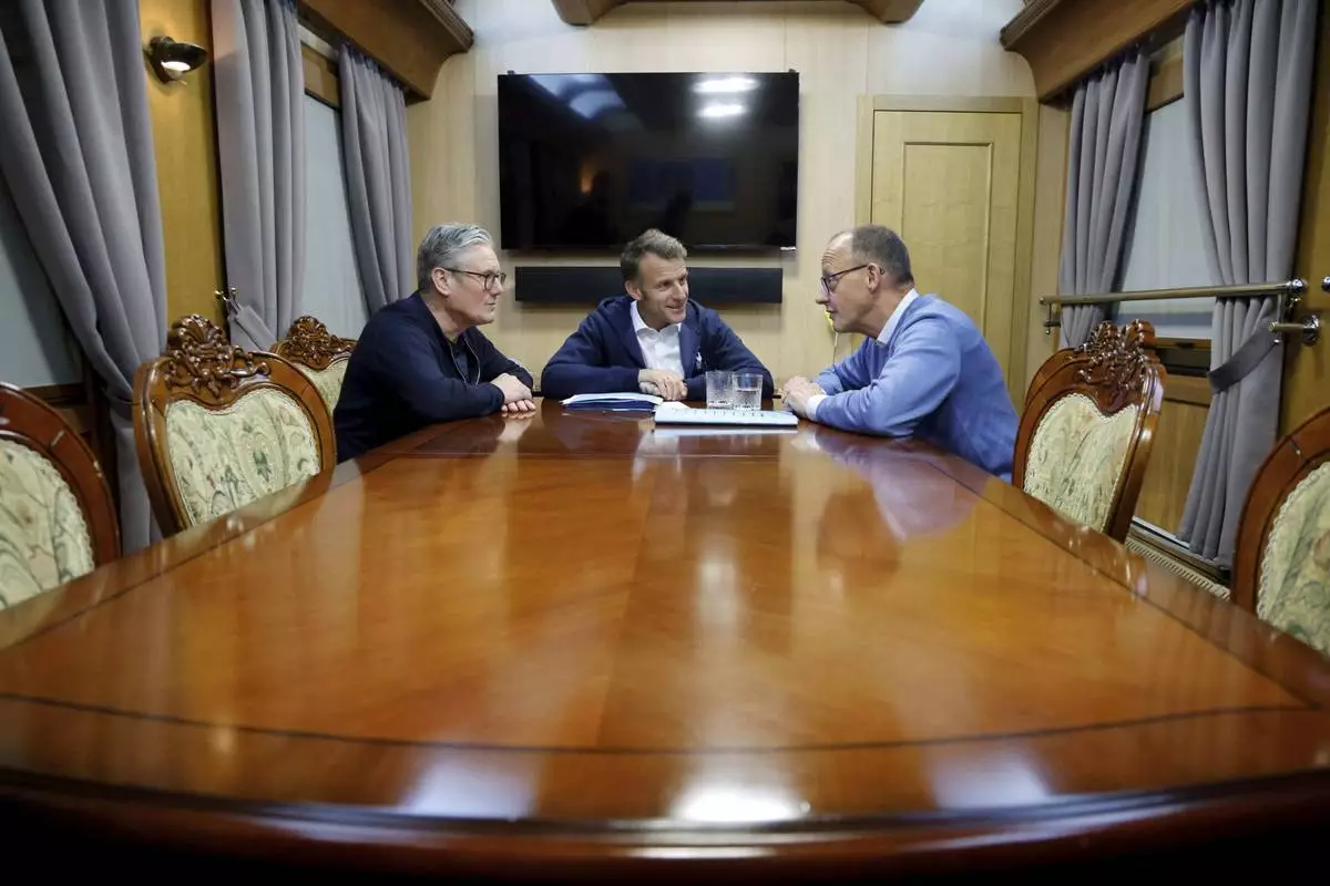 Britain's Prime Minister Keir Starmer, left, meets with French President Emanuel Macron, center, and German Chancellor Friedrich Merz onboard a train to Kyiv in Shegyni, Ukraine, where all three will hold meetings with Ukrainian President Volodymyr Zelenskyy, Friday, May 9, 2025. (Ludovic Marin, Pool Photo via AP)