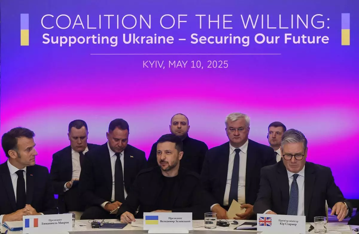 France's President Emmanuel Macron, left, Ukrainian President Volodymyr Zelenskyy and British Prime Minister Keir Starmer, right, sit during a summit at the Mariinskyi Palace, in Kyiv, Ukraine, Saturday, May 10, 2025. (Ludovic Marin, Pool Photo via AP)