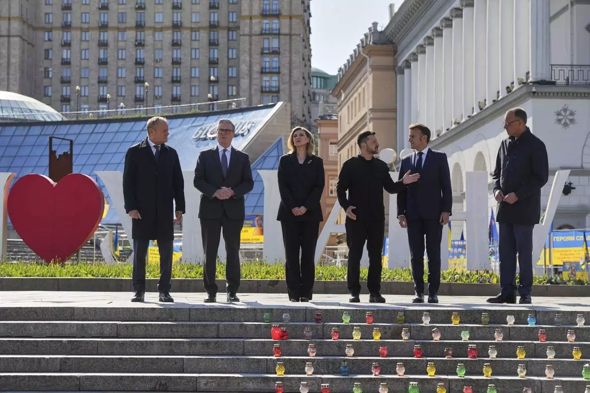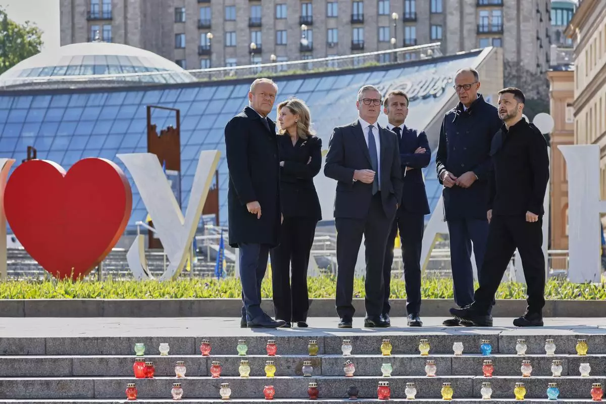 From left, Polish Prime Minister Donald Tusk, U.K. Prime Minister Keir Starmer, Ukraine's First Lady Olena Zelenska Olena Zelenska,Ukrainian President Volodymyr Zelenskyy, French President Emmanuel Macron and German Chancellor Friedrich Merz stand at the memorial of fallen Ukrainian soldiers at independence square in Kyiv, Ukraine, on Saturday, May 10, 2025. (AP Photo/Evgeniy Maloletka)