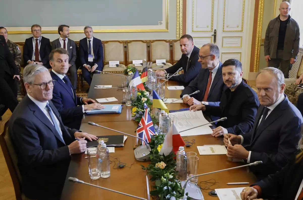 Britain's Prime Minister Keir Starmer, left, France's President Emmanuel Macron, 2nd left, Poland's Prime Minister Donald Tusk, right, Ukraine's President Volodymyr Zelensky, 2nd right, and Germany's Chancellor Friedrich Merz, 3rd right, meet at the Mariinskyi Palace, in Kyiv, Ukraine, Saturday, May 10, 2025. (Ludovic Marin, Pool Photo via AP)