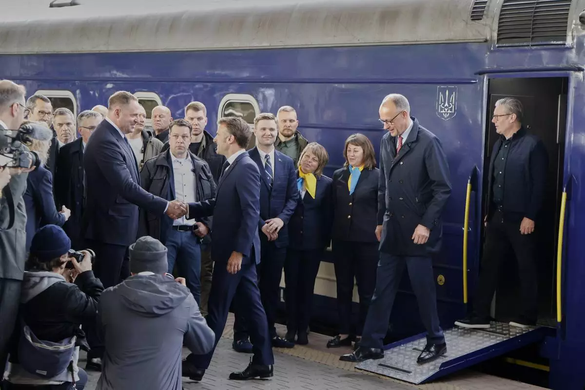 French President Emanuel Macron, 2nd left, Britain's Prime Minister Keir Starmer and German Chancellor Friedrich Merz are welcomed by an Ukraine official at their arrival at Kyiv railway in Ukraine, Saturday, May 10, 2025, where all three will hold meetings with Ukrainian President Volodymyr Zelenskyy. (Ludovic Marin, Pool Photo via AP)