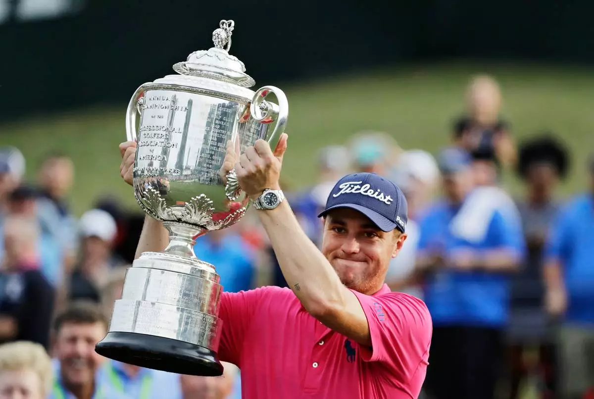 FILE - Justin Thomas poses with the Wanamaker Trophy after winning the PGA Championship golf tournament at the Quail Hollow Club Sunday, Aug. 13, 2017, in Charlotte, N.C. (AP Photo/Chris O'Meara, File)