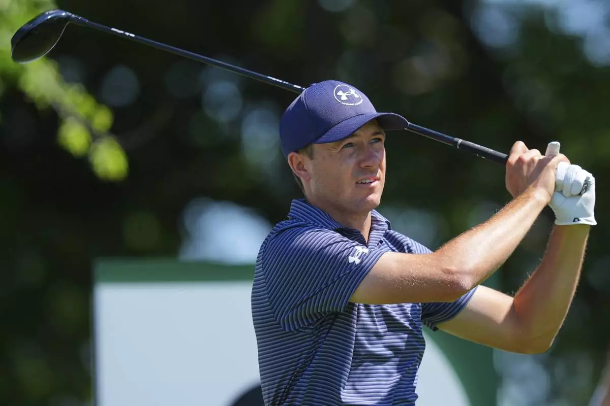 Jordan Spieth watches his tee shot on the second hole during the final round of the CJ Cup Byron Nelson golf tournament in McKinney, Texas, Sunday, May 4, 2025. (AP Photo/LM Otero)