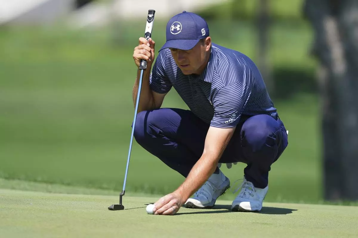 Jordan Spieth sets up for a putt on the first green during the final round of the CJ Cup Byron Nelson golf tournament in McKinney, Texas, Sunday, May 4, 2025. (AP Photo/LM Otero)