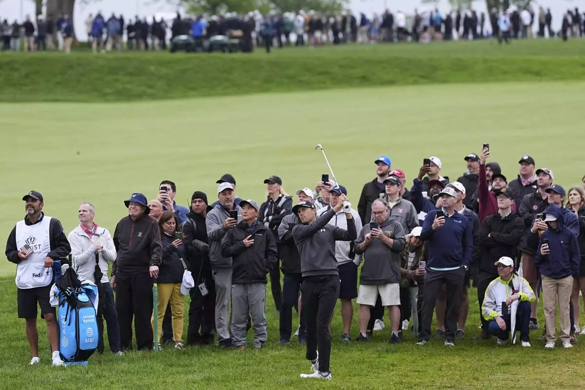 Jordan Spieth hits on the 13th hole during the second round of the Truist Championship golf tournament at the Philadelphia Cricket Club, Friday, May 9, 2025, in Flourtown. (AP Photo/Matt Rourke)