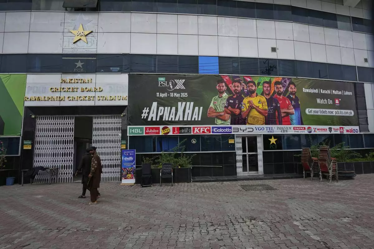 Workers walk past an advertisement board of Pakistan Super League Twenty20 tournament with the pictures of cricketers, installed at the Rawalpindi Cricket Stadium, in Rawalpindi, Pakistan, Friday, May 9, 2025. (AP Photo/Anjum Naveed)