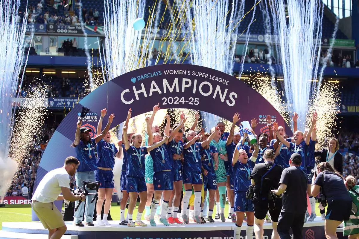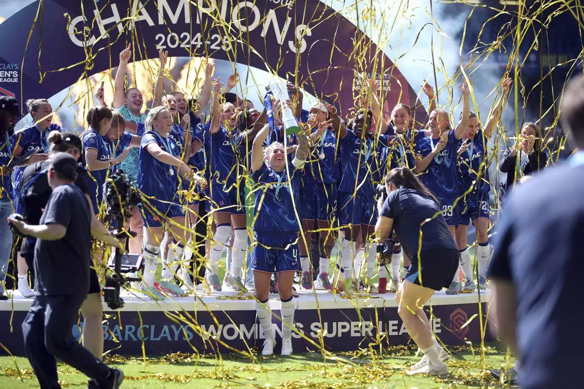Chelsea lift the Women's Super League trophy at Stamford Bridge, London, Saturday May 10, 2025. (Rhianna Chadwick/PA via AP)