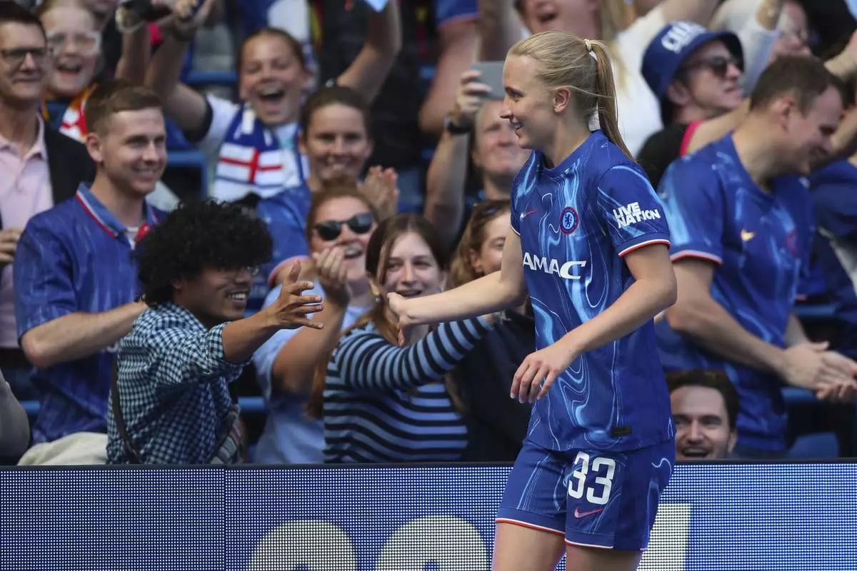 Chelsea's Aggie Beever-Jones celebrates scoring during the Women's Super League soccer match between Chelsea and Liverpool at Stamford Bridge, London, Saturday May 10, 2025. (Rhianna Chadwick/PA via AP)
