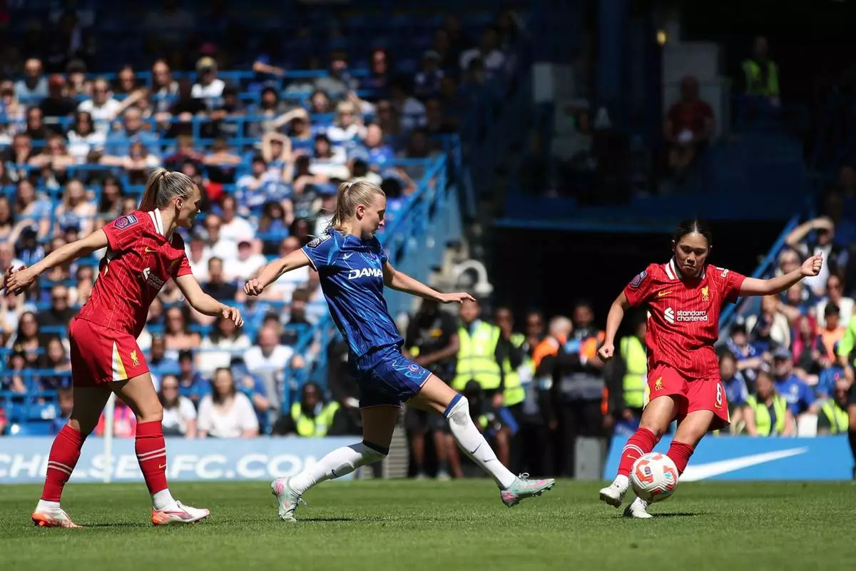 Chelsea's Keira Walsh (left) and Liverpool's Fuka Nagano battle for the ball during the Women's Super League soccer match between Chelsea and Liverpool at Stamford Bridge, London, Saturday May 10, 2025. (Rhianna Chadwick/PA via AP)