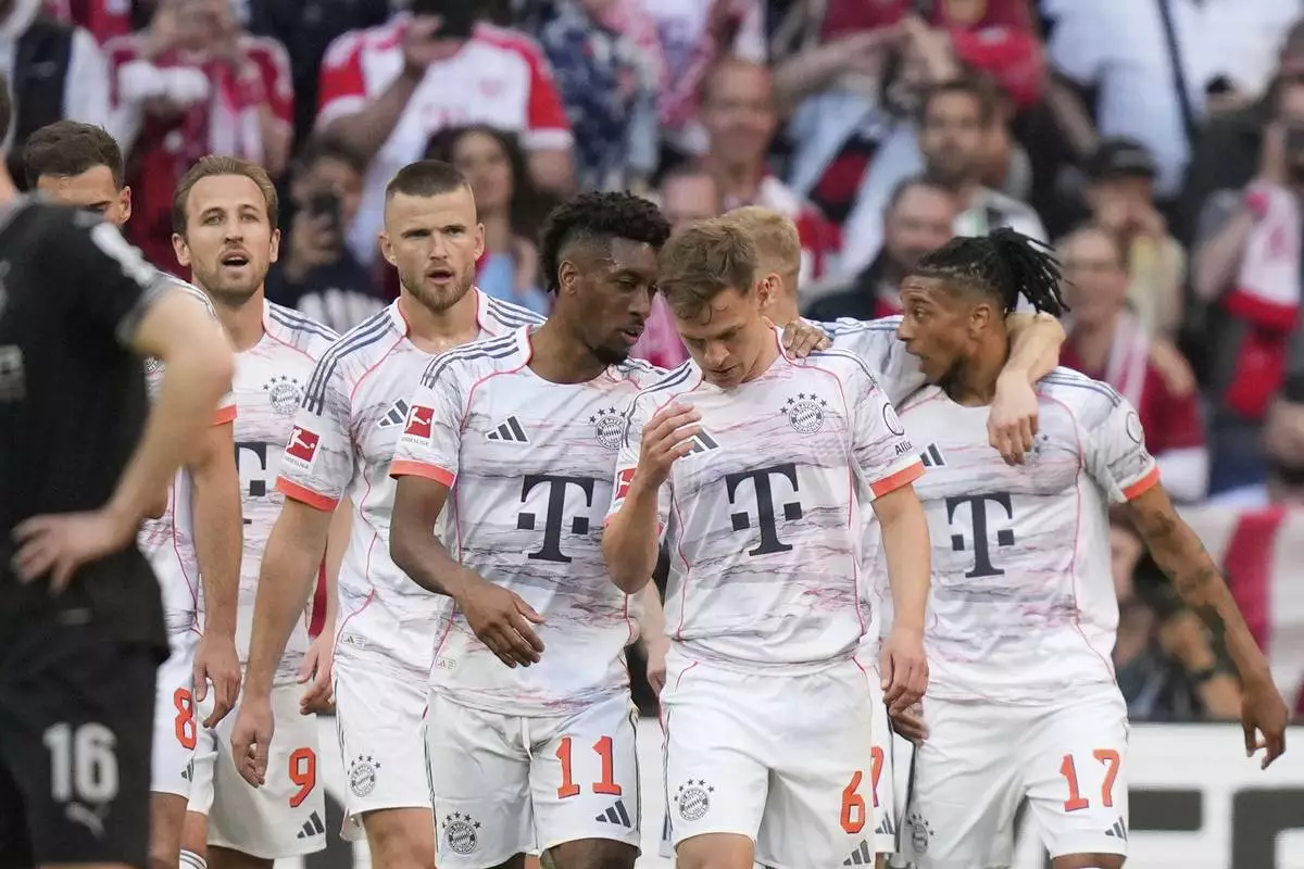 Bayern Munich players celebrate after Bayern's Harry Kane scored his side's opening goal during the German Bundesliga soccer match between FC Bayern Munich and Borussia Moenchengladbach in Munich, Germany, Saturday, May 10, 2025. (AP Photo/Matthias Schrader)