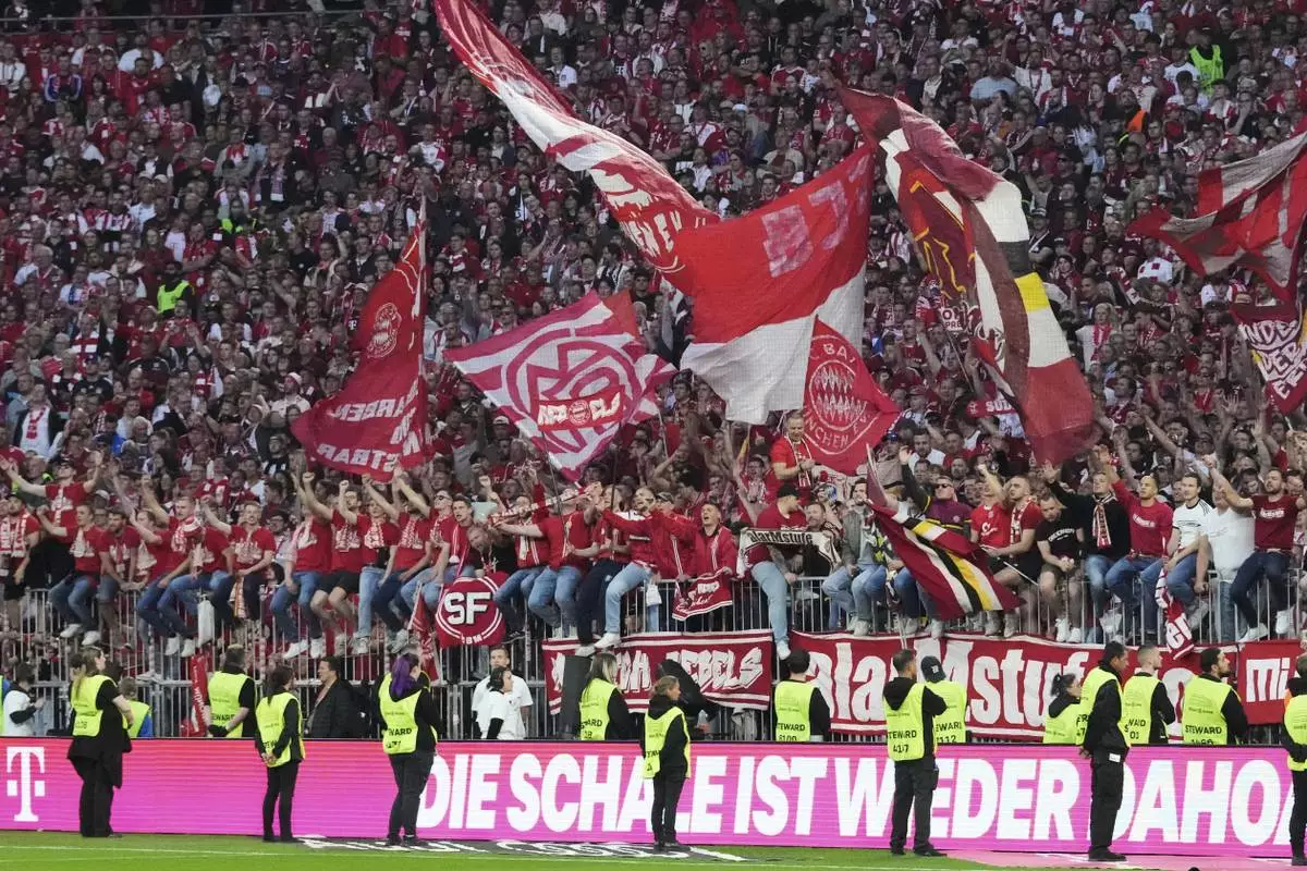 Bayern Munich fans cheer during the German Bundesliga soccer match between FC Bayern Munich and Borussia Moenchengladbach in Munich, Germany, Saturday, May 10, 2025. (AP Photo/Matthias Schrader)