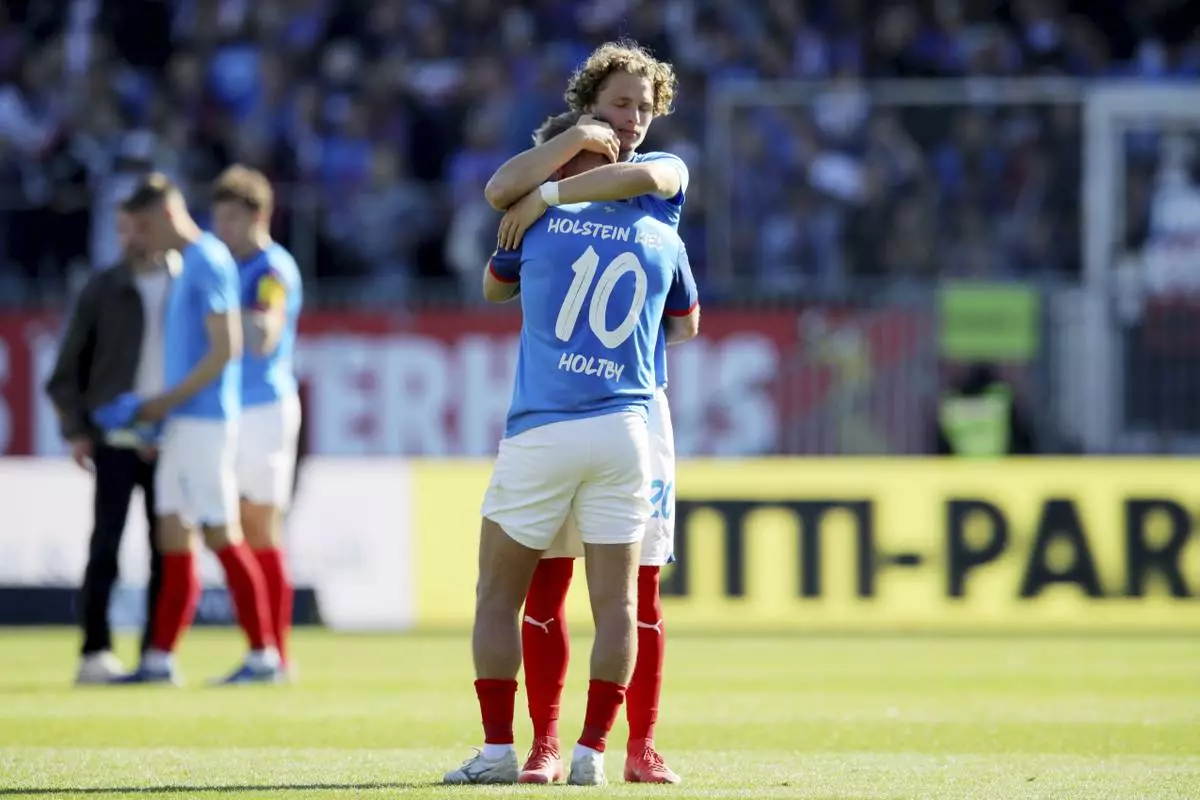 Kiel's Lewis Holtby is comforted by Fiete Arp after the German Bundesliga soccer match between Holstein Kiel and SC Freiburg in Kiel, Germany, Saturday, May 10, 2025. (Claus Bergmann/dpa via AP)