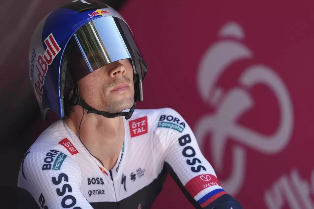 Slovenia's Primoz Roglic at the start of the time trial stage 2 of the Giro d'Italia cycling race, in Tirana, Albania, Saturday, May 10, 2025. (Gian Mattia D'Alberto/LaPresse via AP)