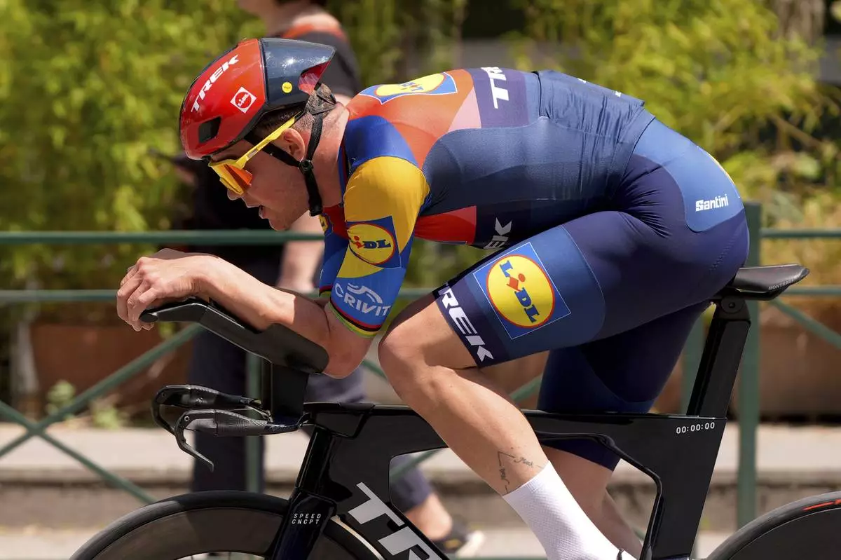 Denmark's Mads Pedersen competes during the second stage of the Giro d'Italia cycling race, an individual time trial from Tirana to Tirana, Albania, Saturday, May 10, 2025. (Fabio Ferrari/LaPresse via AP)