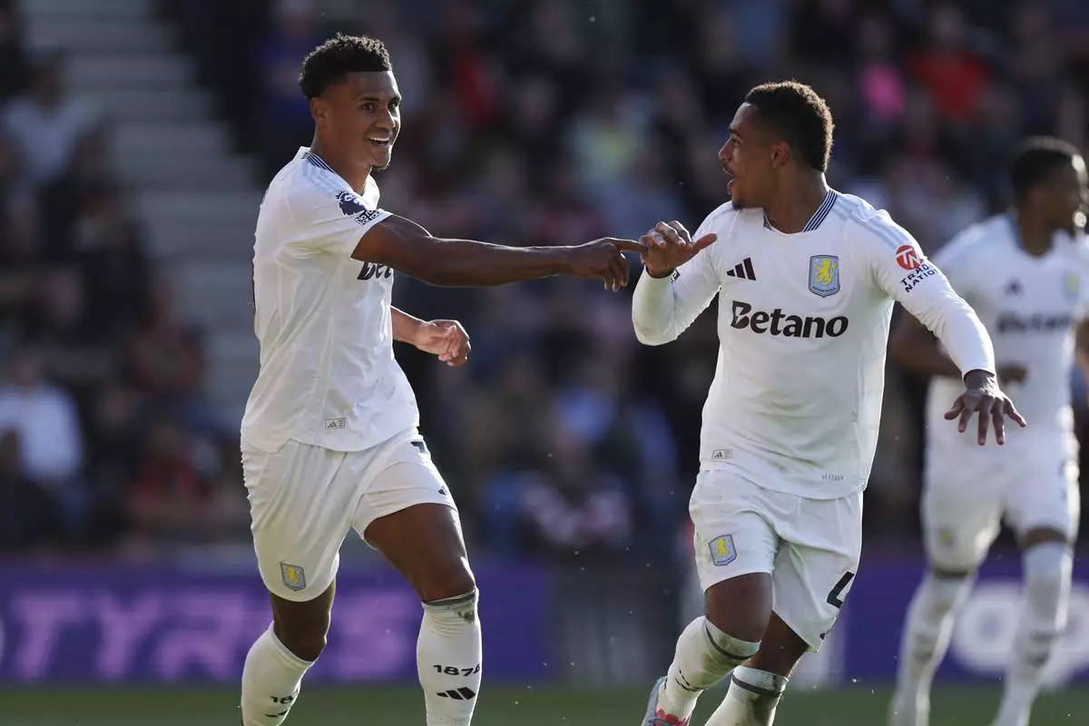 Aston Villa's Ollie Watkins, left, celebrates scoring with Jacob Ramsey during the English Premier League soccer match between Bournemouth and Aston Villa at the Vitality Stadium, Bournemouth, England, Saturday May 10, 2025. (Steven Paston/PA via AP)