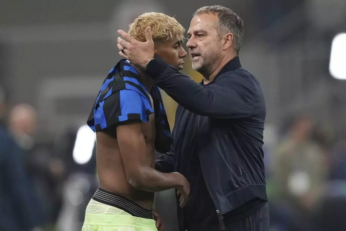 Barcelona's head coach Hansi Flick comforts Lamine Yamal after the Champions League semifinal second leg soccer match between Inter Milan and Barcelona at San Siro stadium in Milan , Italy, Tuesday, May 6, 2025. (AP Photo/Antonio Calanni)