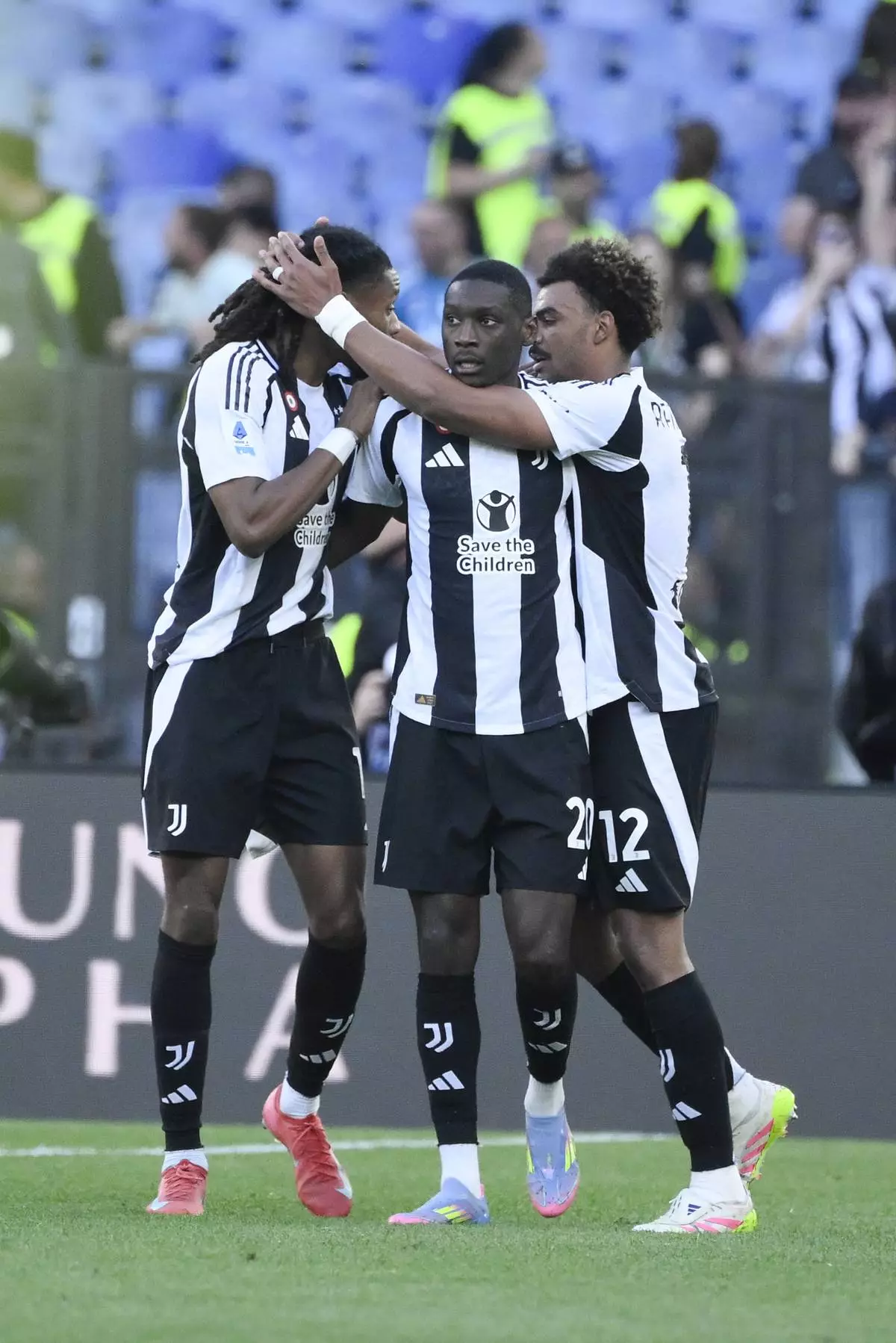 Juventus's Randal Kolo Muani, left, celebrates scoring during the Serie A soccer match between Lazio and Juventus at Rome's Olympic stadium, Saturday, May 10, 2025. (Fabrizio Corradetti/LaPresse via AP)
