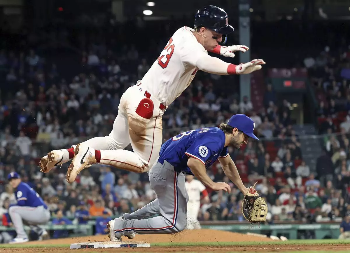 Boston Red Sox's Romy Gonzalez (23) is airborne as he collides with Texas Rangers first baseman Josh Smith in the sixth inning of a baseball game on Wednesday, May 7, 2025, in Boston. (AP Photo/Jim Davis)
