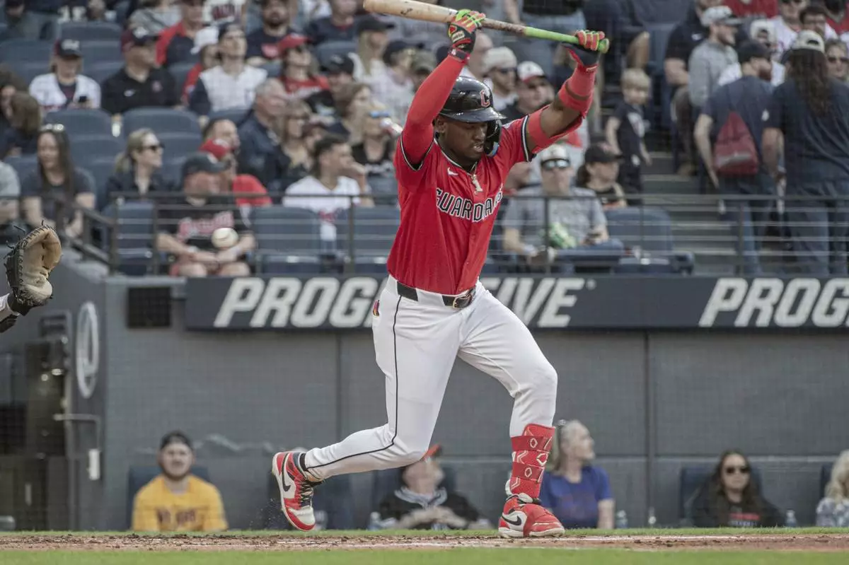Cleveland Guardians' Angel Martinez dodges an inside pitch from Philadelphia Phillies starting pitcher Ranger Suarez during the third inning of a baseball game Saturday, May 10, 2025, in Cleveland. (AP Photo/Phil Long)