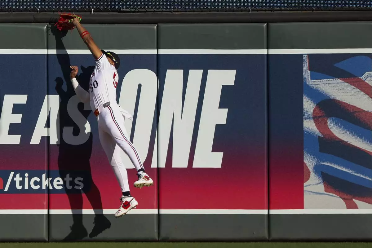 Minnesota Twins right fielder Willi Castro (50) makes a leaping catch at the wall for an out on the San Francisco Giants during the first inning of a baseball game Saturday, May 10, 2025, in Minneapolis. (AP Photo/Ellen Schmidt)
