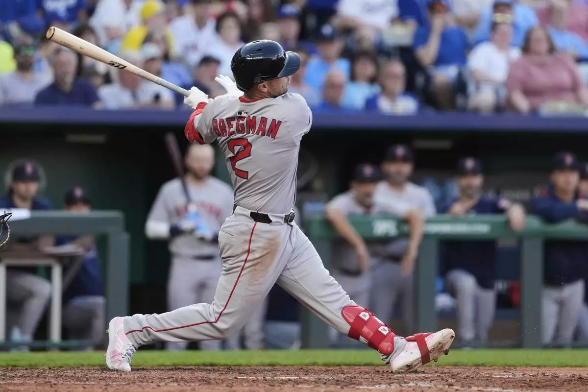 Boston Red Sox's Alex Bregman watches his RBI single during the fifth inning of a baseball game against the Kansas City Royals, Saturday, May 10, 2025, in Kansas City, Mo. (AP Photo/Charlie Riedel)