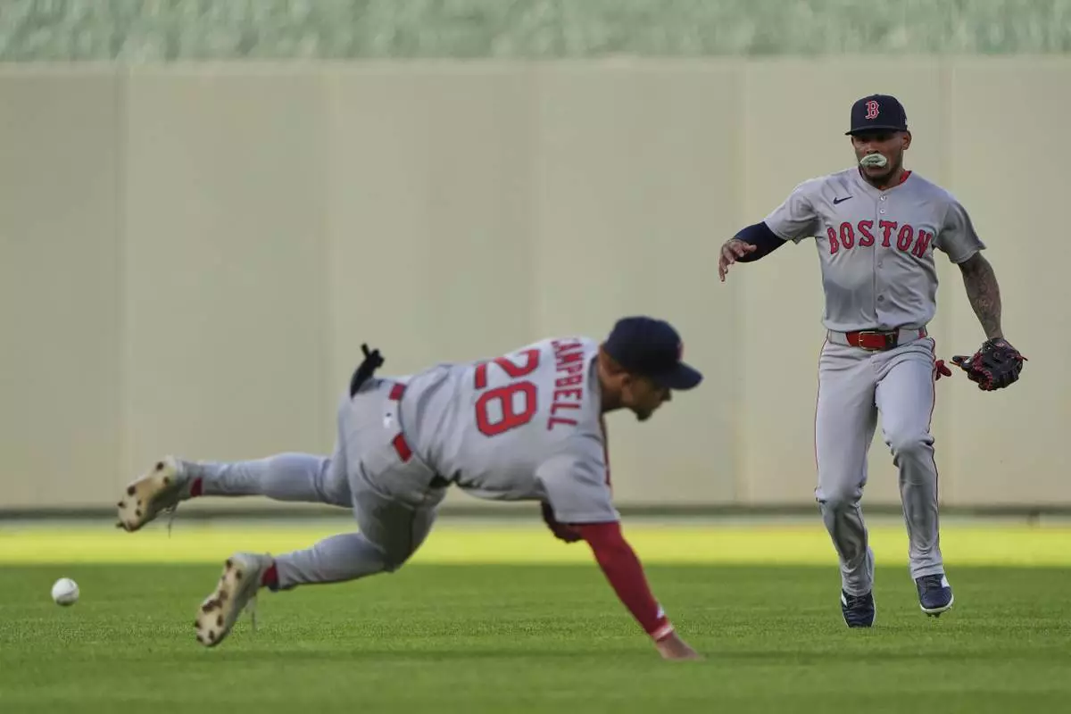 Boston Red Sox second baseman Kristian Campbell (28) and center fielder Ceddanne Rafaela chase after an RBI single bit by Kansas City Royals' Mark Canha during the third inning of a baseball game Saturday, May 10, 2025, in Kansas City, Mo. (AP Photo/Charlie Riedel)
