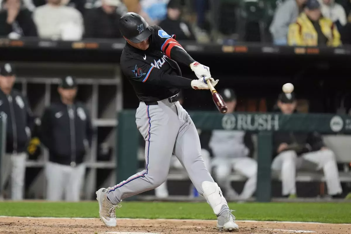 Miami Marlins' Eric Wagaman hits a two-run triple during the eighth inning of a baseball game against the Chicago White Sox, Saturday, May 10, 2025, in Chicago. (AP Photo/Erin Hooley)