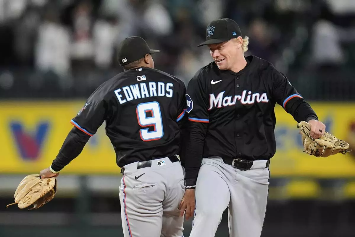 Miami Marlins' Kyle Stowers, right, and Xavier Edwards (9) celebrate after their win over the Chicago White Sox in a baseball game Saturday, May 10, 2025, in Chicago. (AP Photo/Erin Hooley)