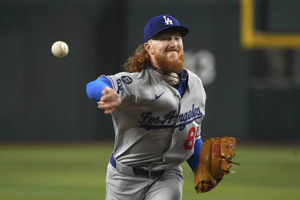 Los Angeles Dodgers pitcher Dustin May throws against the Arizona Diamondbacks in the first inning during a baseball game, Saturday, May 10, 2025, in Phoenix. (AP Photo/Rick Scuteri)