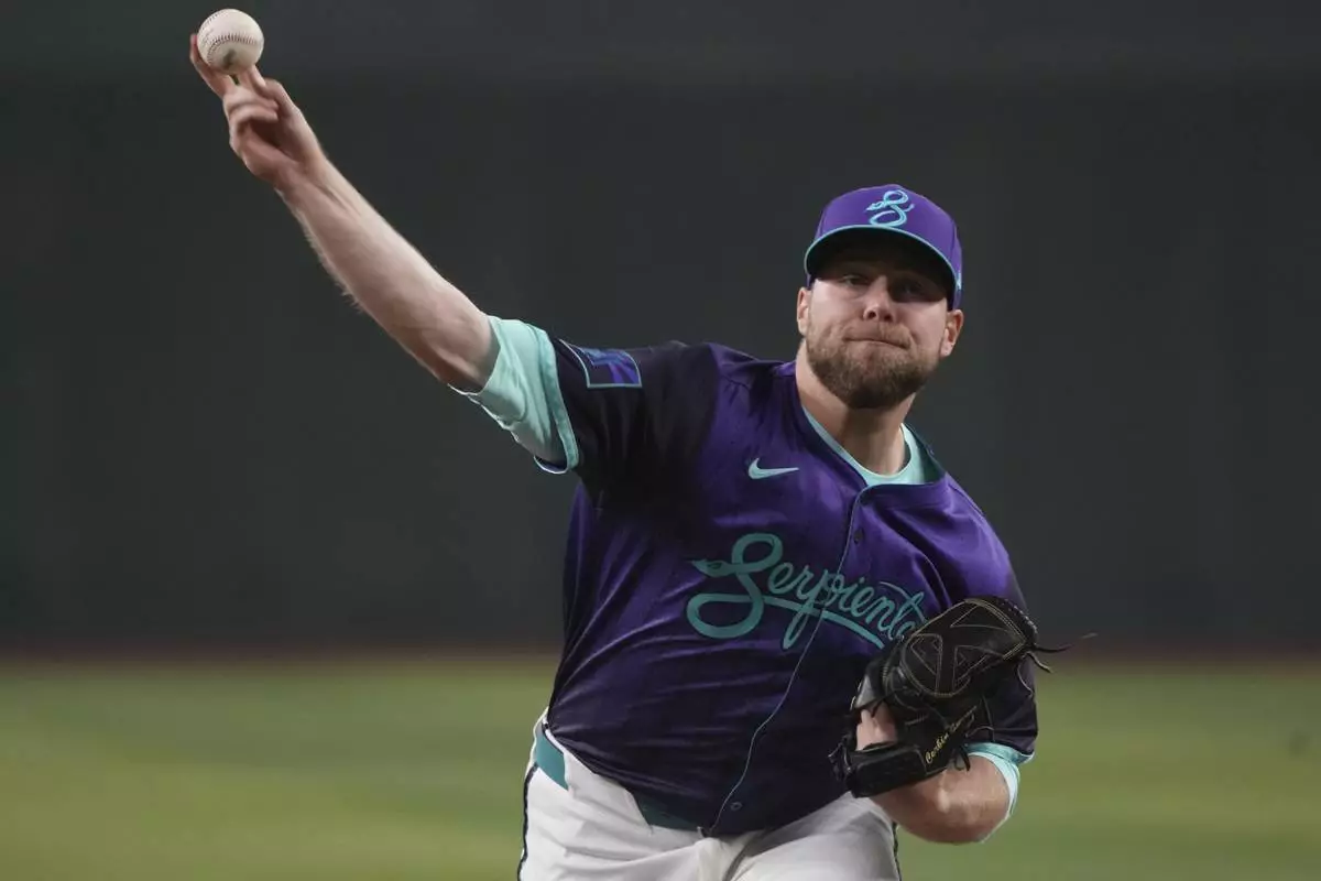 Arizona Diamondbacks pitcher Corbin Burnes throws against the Los Angeles Dodgers in the first inning during a baseball game, Saturday, May 10, 2025, in Phoenix. (AP Photo/Rick Scuteri)