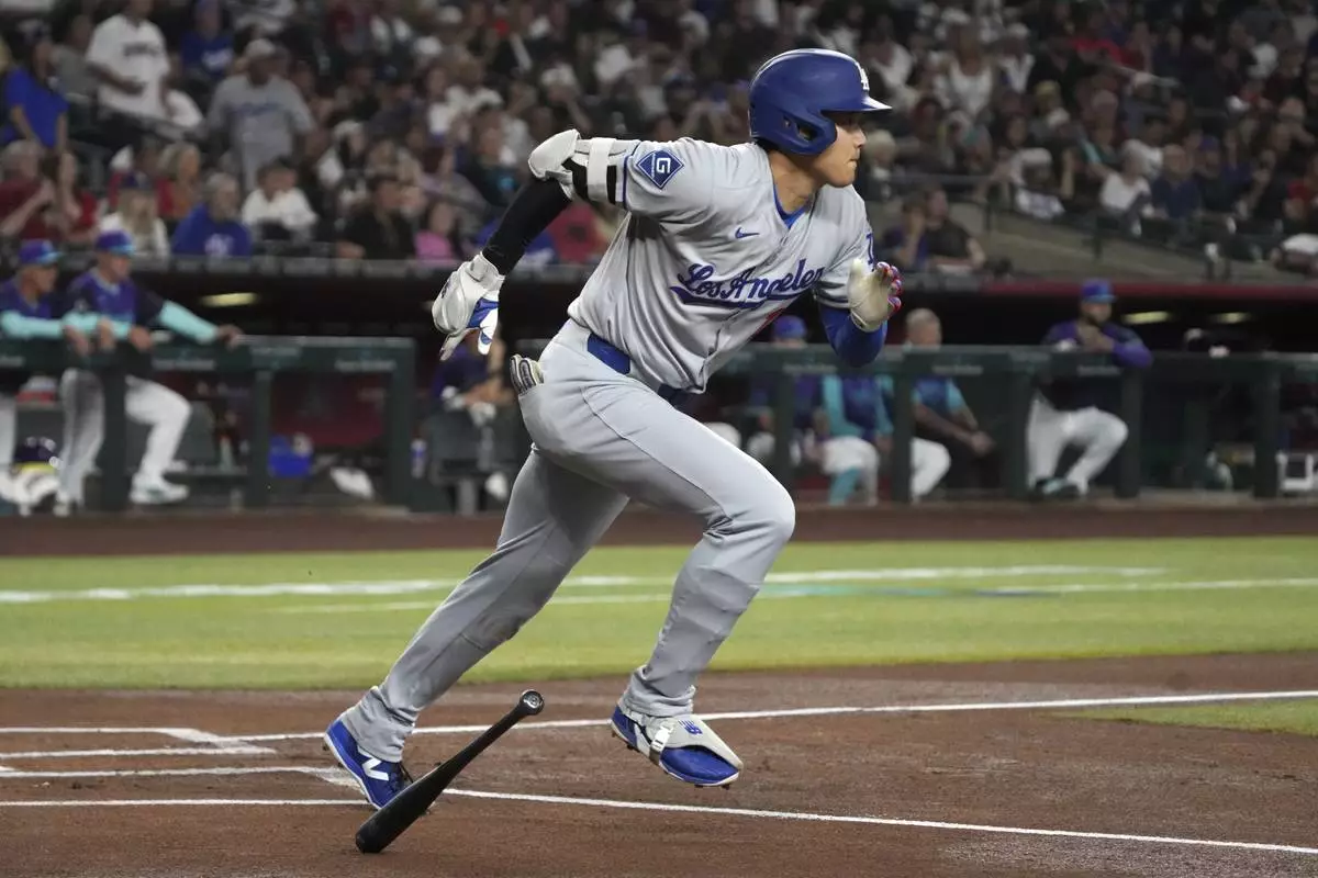 Los Angeles Dodgers' Shohei Ohtani starts to run after hitting a single against the Arizona Diamondbacks in the first inning during a baseball game, Saturday, May 10, 2025, in Phoenix. (AP Photo/Rick Scuteri)