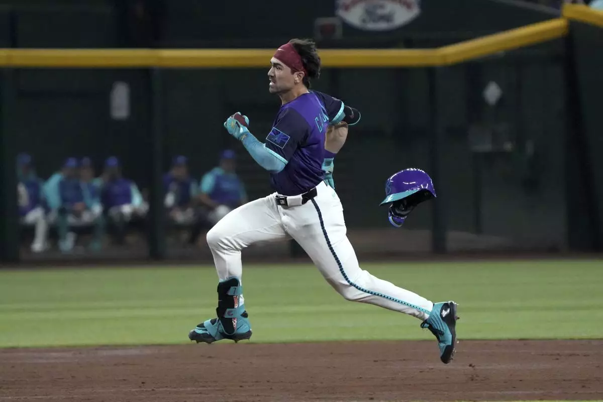 Arizona Diamondbacks' Corbin Carroll runs after hitting a triple against the Los Angeles Dodgers in the third inning during a baseball game, Saturday, May 10, 2025, in Phoenix. (AP Photo/Rick Scuteri)
