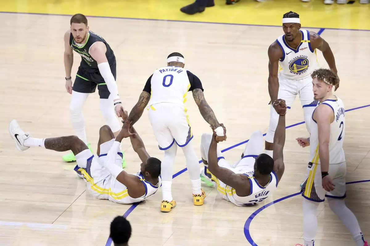 Golden State Warriors' Draymond Green and Jonathan Kuminga are helped up by Gary Payton II, Jimmy Butler III and Minnesota Timberwolves' Donte Divincenzo in 1st quarter during NBA Western Conference Semifinals' Game 3 at Chase Center in San Francisco on Saturday, May 10, 2025. (Scott Strazzante/San Francisco Chronicle via AP)