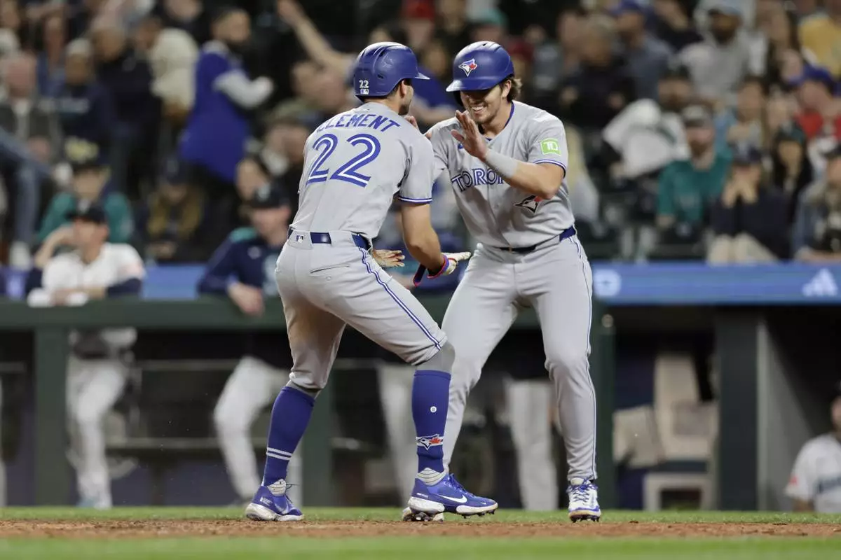 Toronto Blue Jays' Ernie Clement (22) celebrates with Addison Barger, right, after scoring against the Seattle Mariners during the eighth inning of a baseball game, Saturday, May 10, 2025, in Seattle. (AP Photo/John Froschauer)