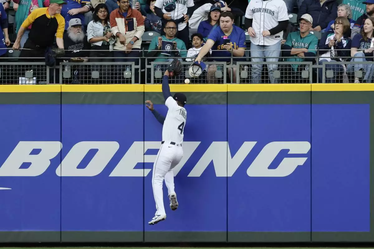 Seattle Mariners right fielder Leody Taveras leaps but is unable to catch the home run hit by Toronto Blue Jays' Bo Bichette during the fifth inning of a baseball game, Saturday, May 10, 2025, in Seattle. (AP Photo/John Froschauer)