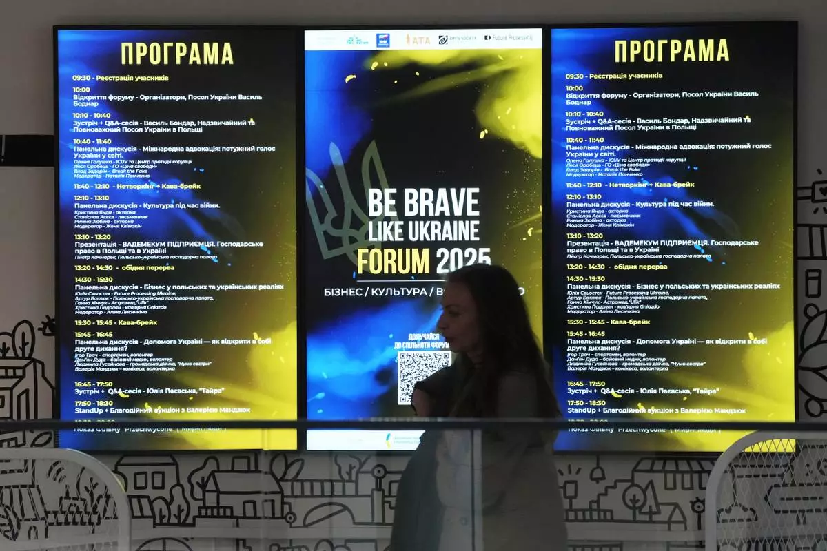 Two people stand near a poster for a forum devoted to Polish-Ukrainian solidarity in Warsaw, Poland, Saturday, May 10, 2025. (AP Photo/Czarek Sokolowski)