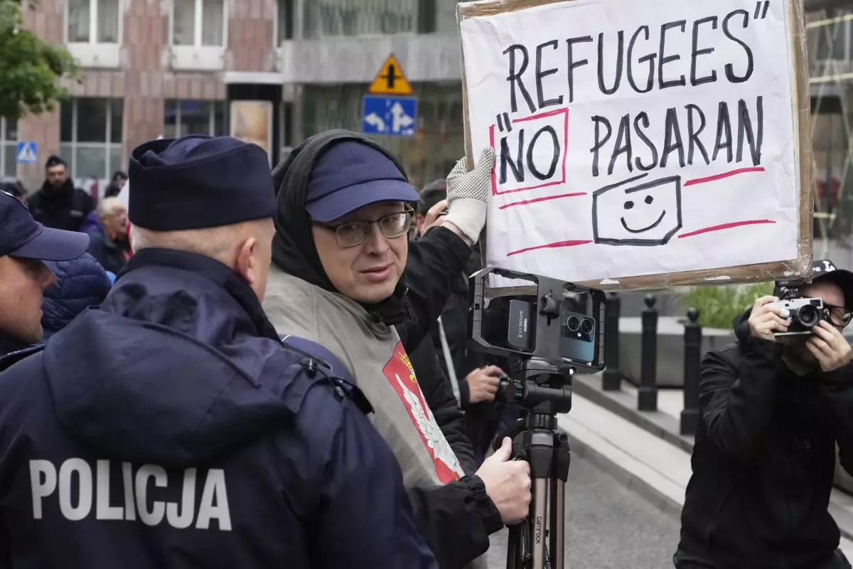 A man holds a poster that says "Refugees NO pasaran" in Warsaw, Poland, Saturday, May 10, 2025. (AP Photo/Czarek Sokolowski)