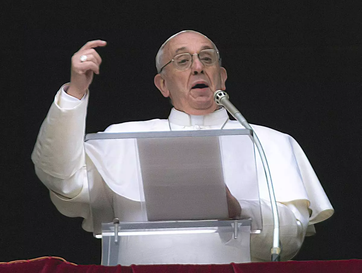 FILE - Pope Francis gestures on the first Sunday window appearance of his papacy to pray the Angelus and bless the faithful gathered in St. Peter's Square at the Vatican, Sunday, March 17, 2013. (AP Photo/Domenico Stinellis, File)