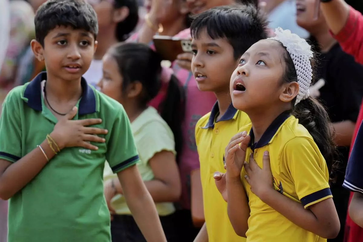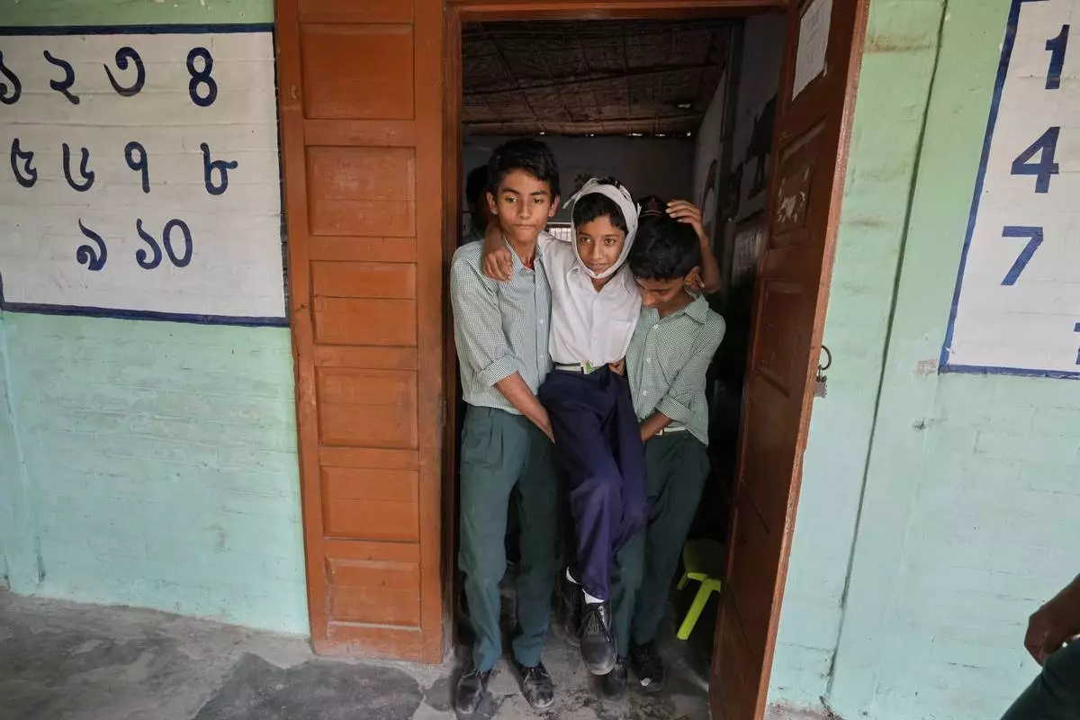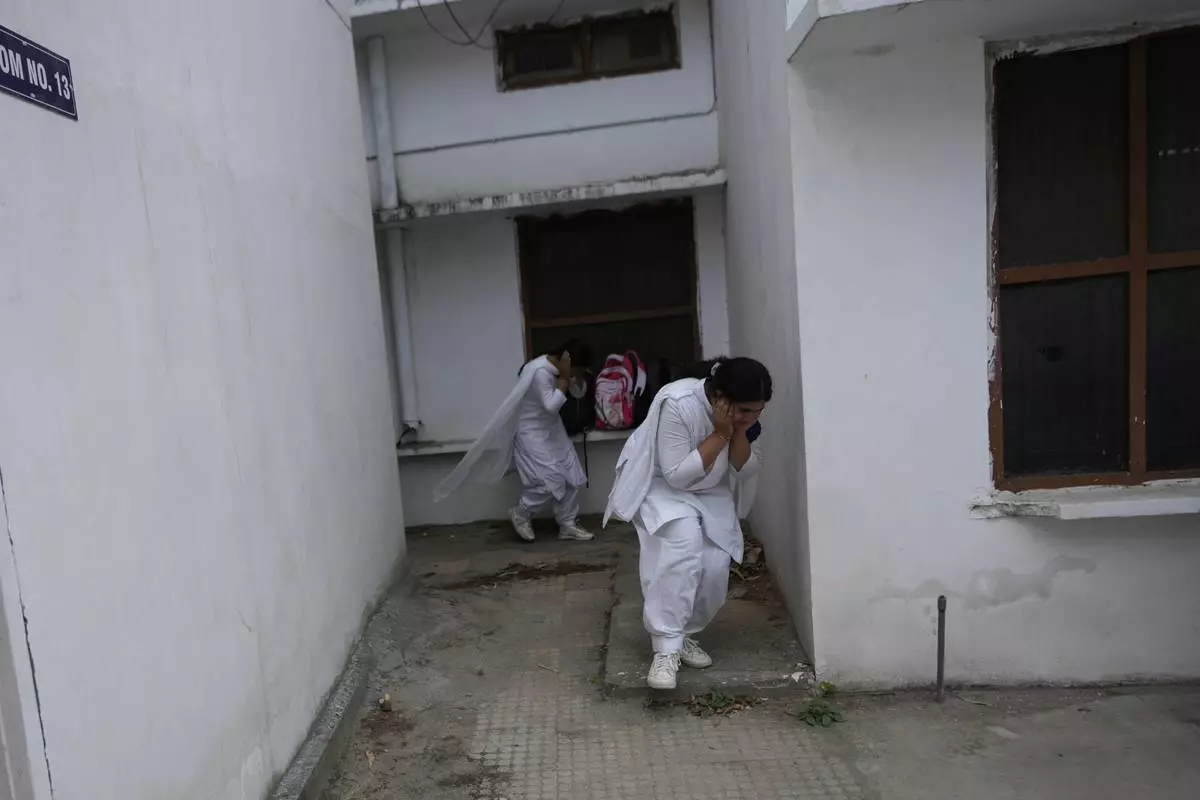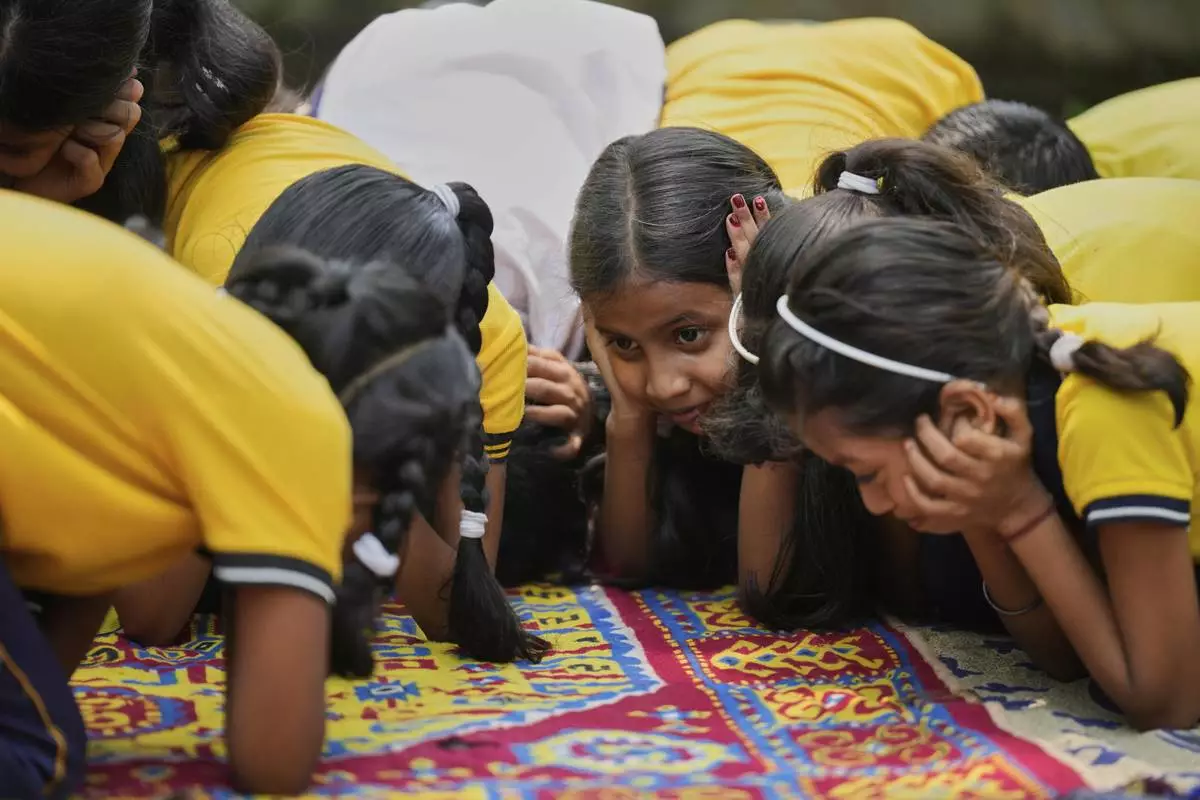 School students react during a mock drill to train civilians and security personnel to respond in case of attack, in Guwahati, India, Wednesday, May 7, 2025 amid rising fears of wider conflict following India's strikes in Pakistan. (AP Photo/Anupam Nath)