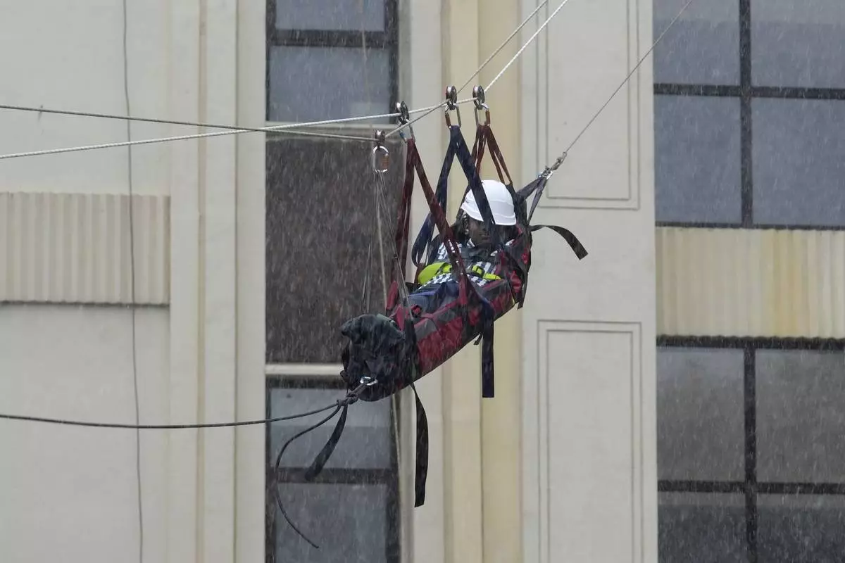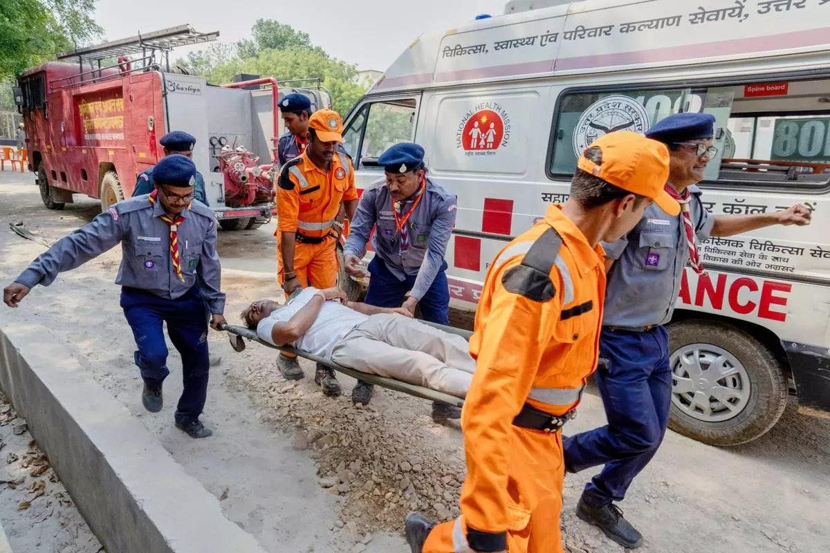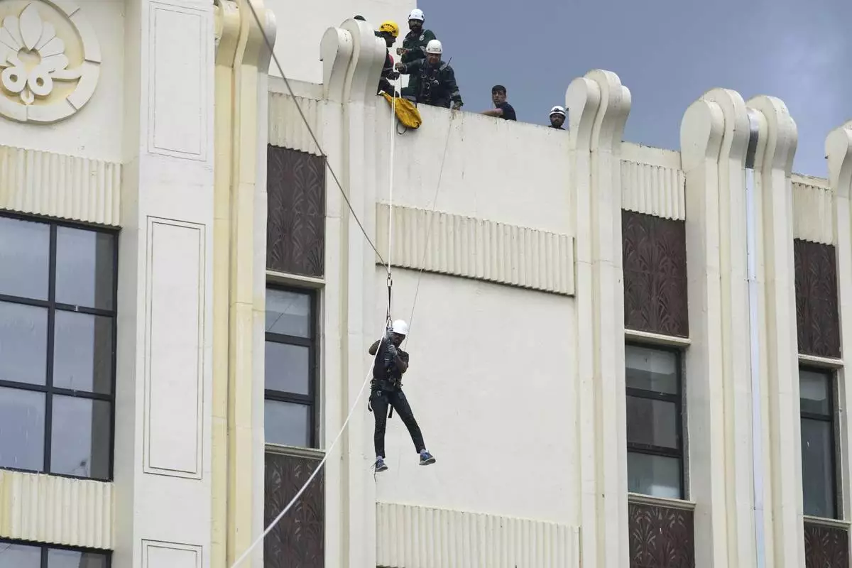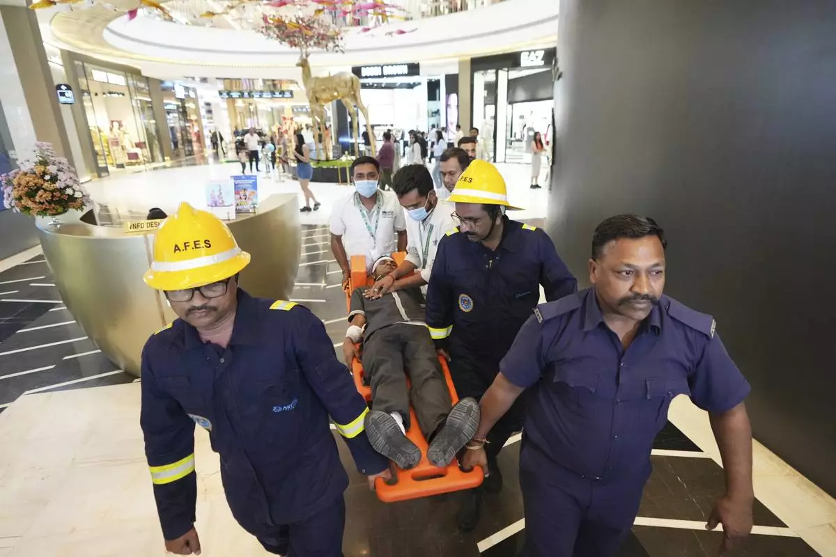 Fire brigade workers and paramedics participate in a security mock drill at a mall in Ahmedabad, India, Wednesday, May 7, 2025, amid rising fears of wider conflict following India's strikes in Pakistan. (AP Photo/Ajit Solanki)